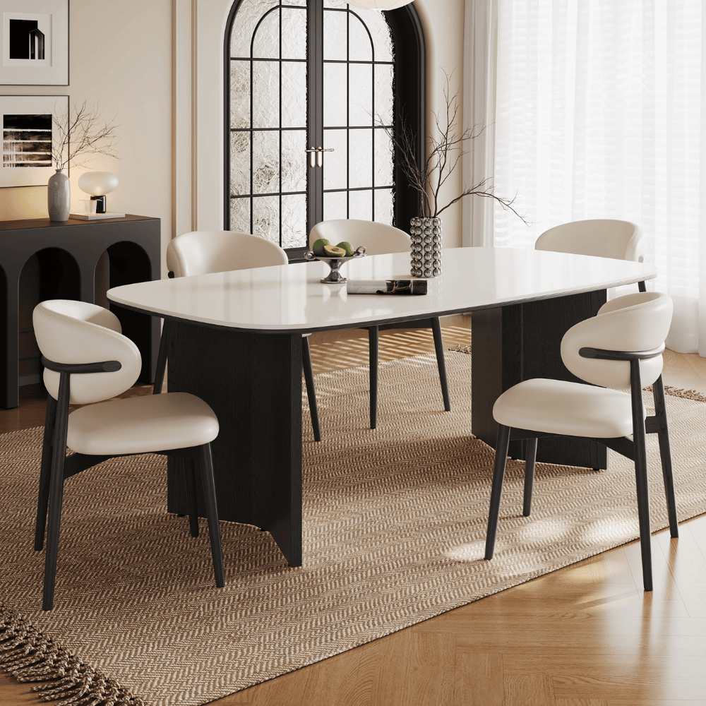 Curved "C-Style" Designer Chairs: The set includes ergonomic chairs with a unique wrap-around backrest. The cream-toned upholstery and black-finished wooden frames echo the table’s high-contrast theme.