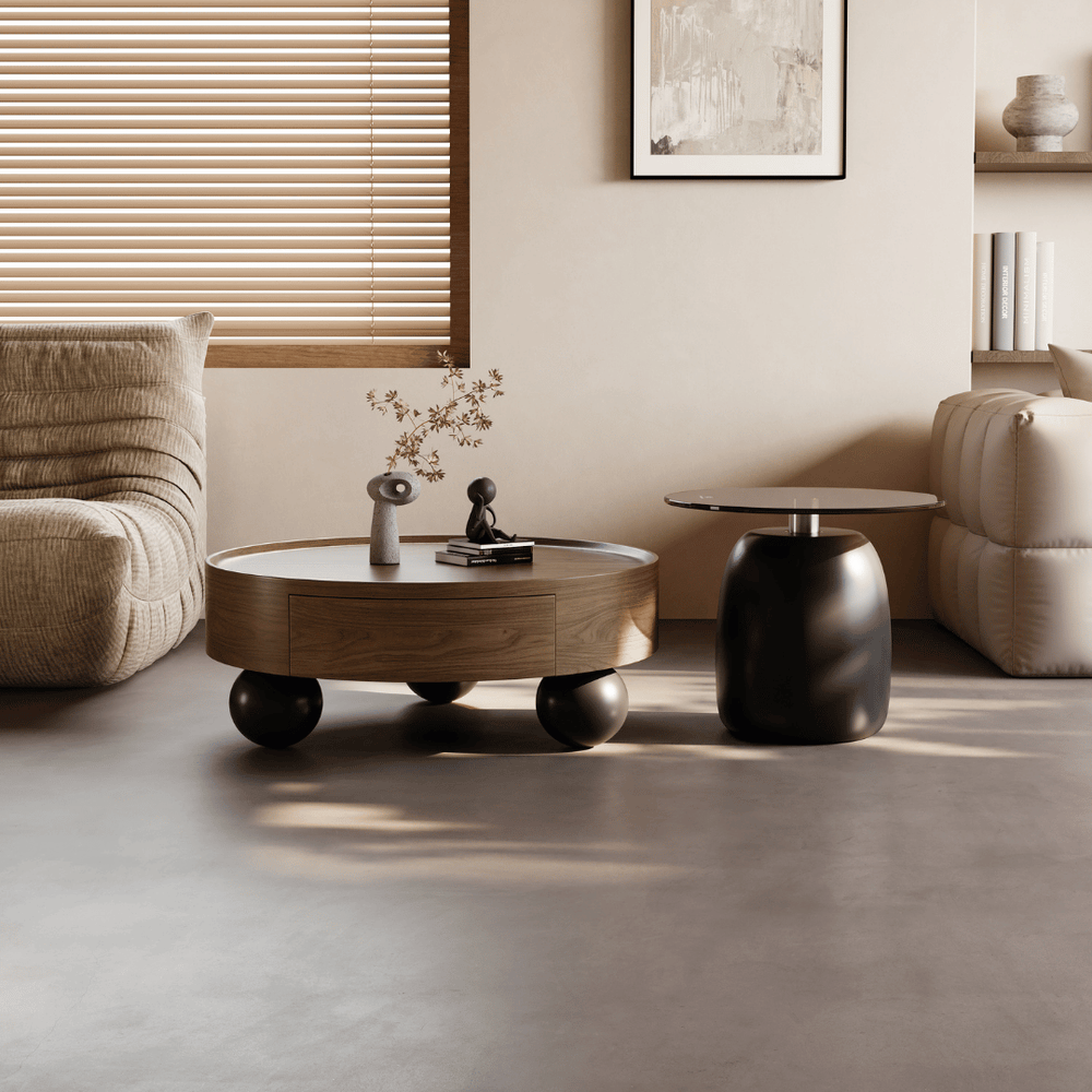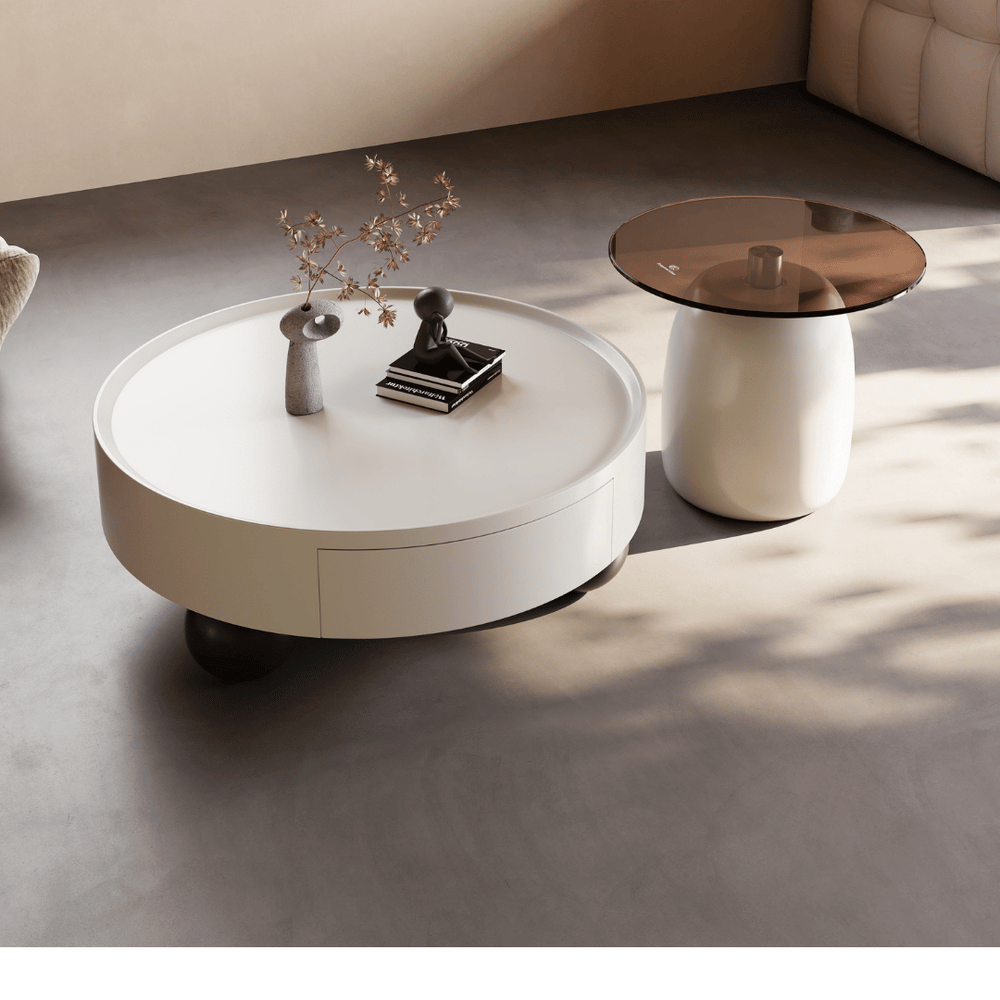 Hidden Seamless Storage: Designed for the minimalist, the main drum features an integrated pull-out drawer. It’s the perfect hidden compartment for remotes, chargers, and magazines, keeping your tabletop clutter-free.