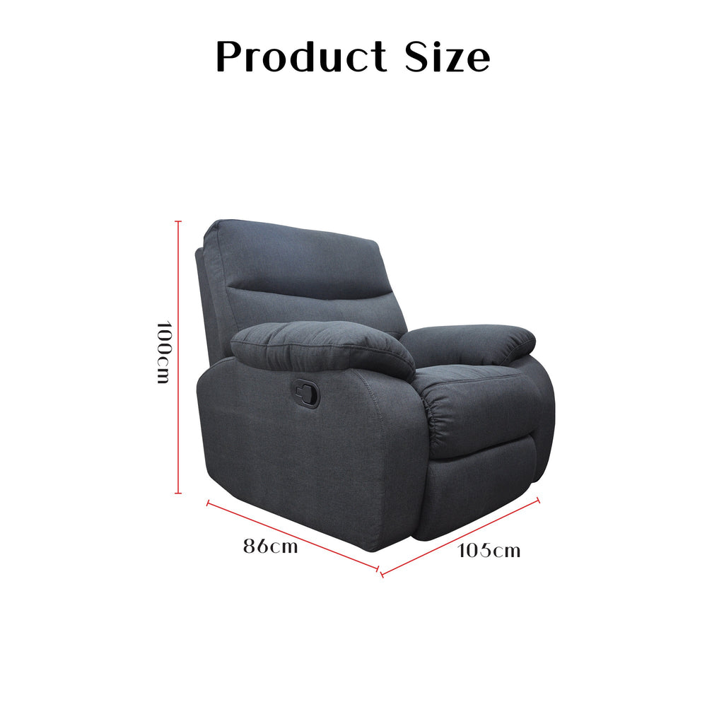 • Premium pet-friendly, anti-scratch fabric • Easy-clean technology — wipe stains using only water and a cloth • Smooth manual recliner with extendable footrest • Plush backrest, seat, and arm padding • Supportive ergonomic structure for daily comfort • Compact silhouette perfect for smaller spaces • Clean, contemporary upholstery in deep charcoal grey