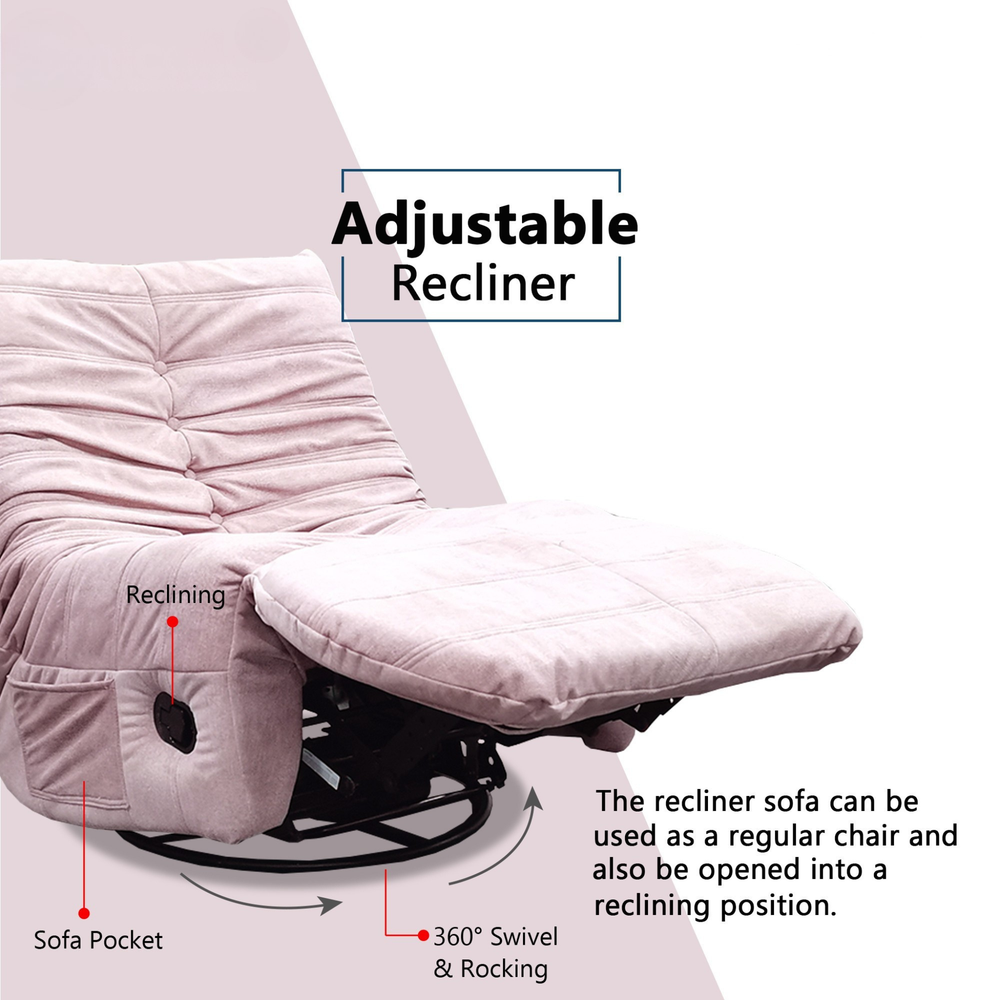 ✔ Pet-friendly, anti-scratch, and easy-clean upholstery ✔ Smooth manual reclining function for personalized comfort ✔ 360° swivel base and gentle rocking motion ✔ Plush ruched cushioning for superior softness and support ✔ Built-in side pocket for convenient storage