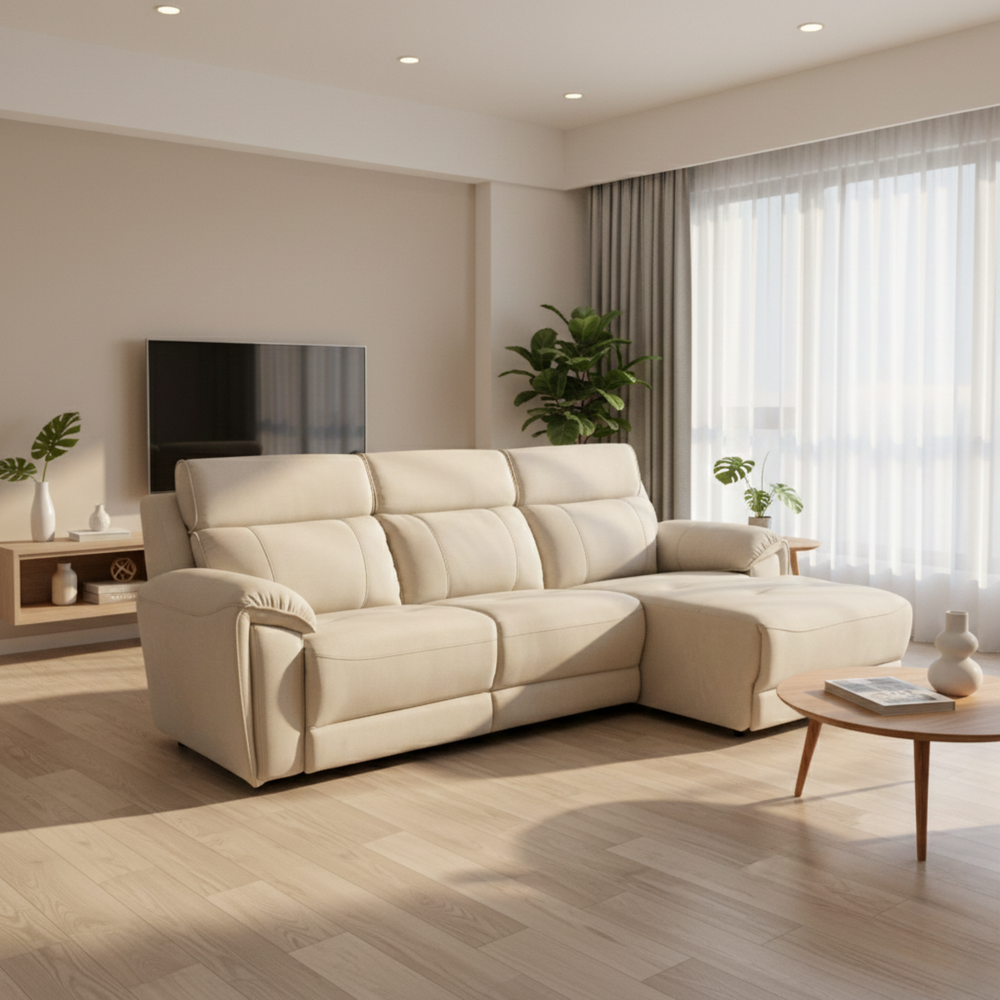 With its spacious L-shaped layout and warm beige fabric, this sofa is perfect for families, relaxation, and contemporary living.