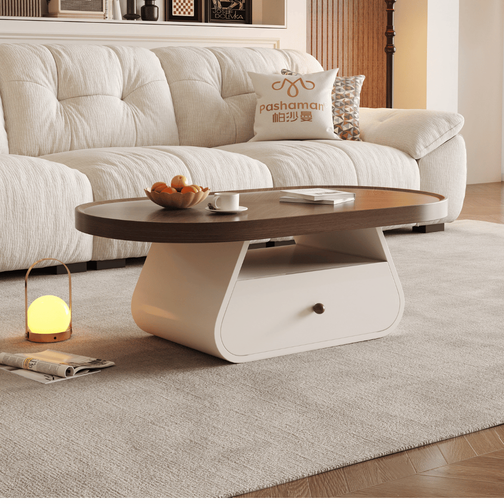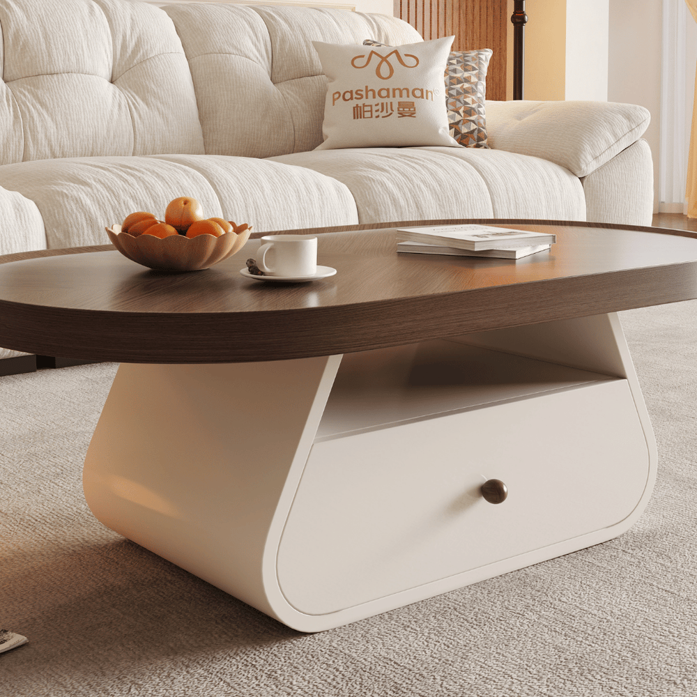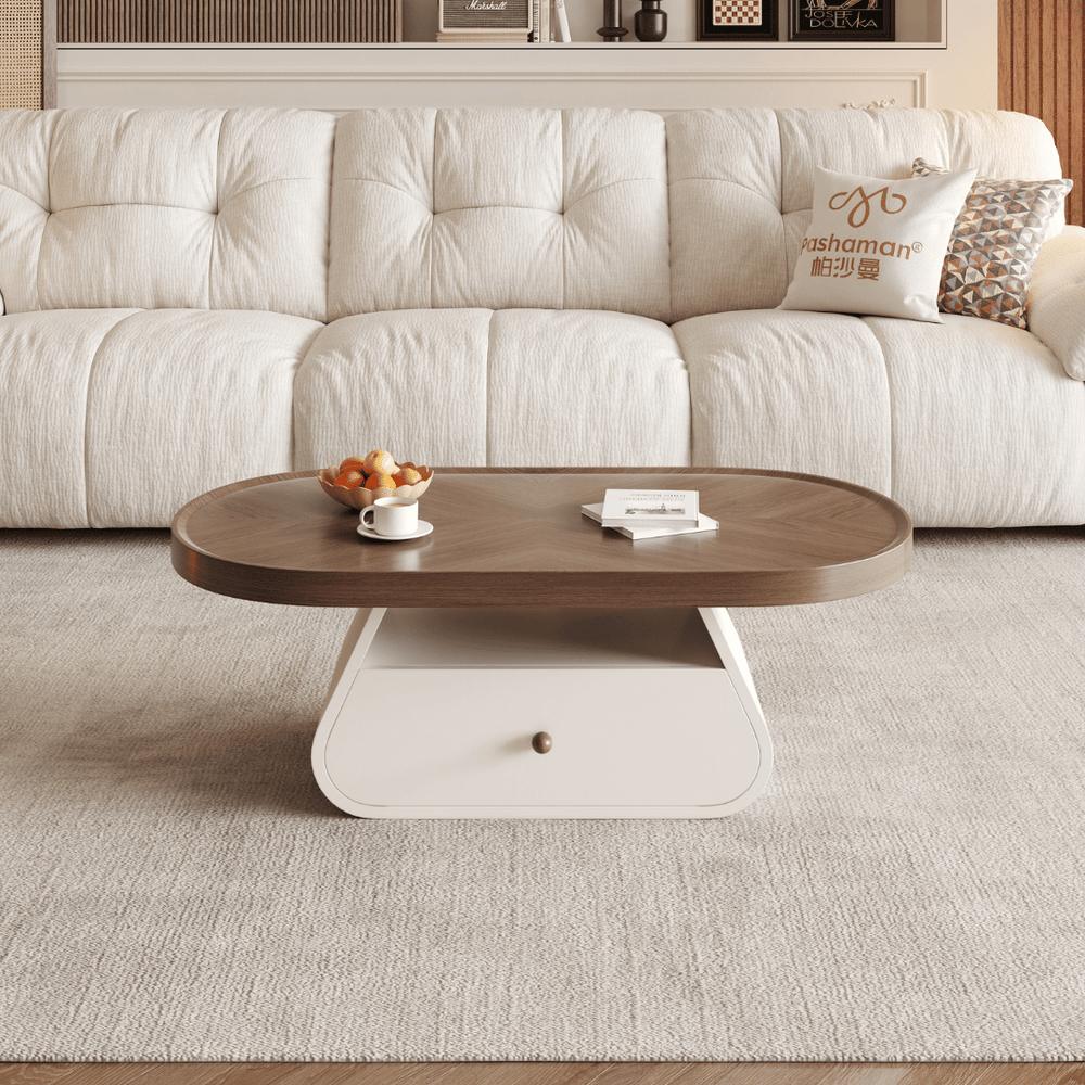 The Floris is an oval, contemporary coffee table distinguished by its warm wood-toned surface and a contrasting, clean white pedestal base. It is engineered to bring a sense of organic flow to your living space while providing discrete storage solutions for a clutter-free environment.