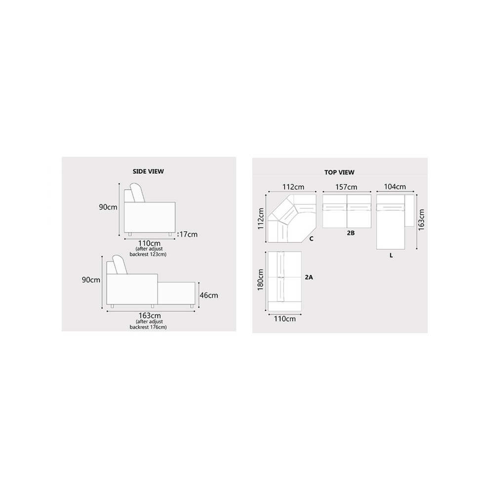 • L: L 104 cm × W 163 cm (176 cm after backrest adjustment) × H 90 cm
