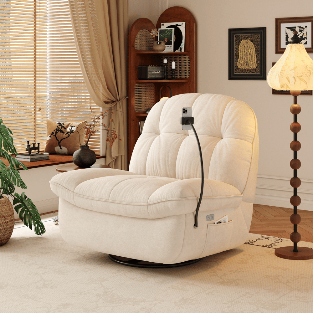 The Gillian Armchair is the ultimate relaxation station, combining plush, tufted comfort with high-tech convenience. Designed for those who want their leisure time to be completely uninterrupted.