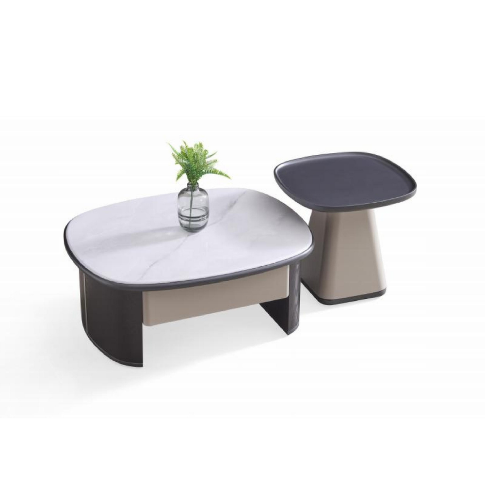Soft, Organic Tabletops: Both the main coffee table and the taller side table feature tops with rounded, irregular oval or pebble-like shapes. This fluidity softens the overall look and introduces an organic element to the design.