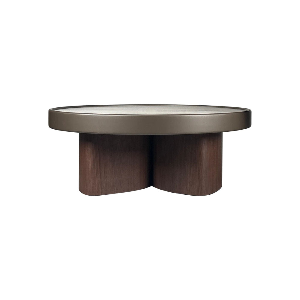 Encircling the edge is a sleek metallic-painted trim, a sculptural accent that adds contrast while enhancing the table’s bold profile. The design is anchored by a distinctive cross-shaped pedestal base in rich black walnut veneer, showcasing natural wood grain and softly rounded edges for warmth and organic character.
