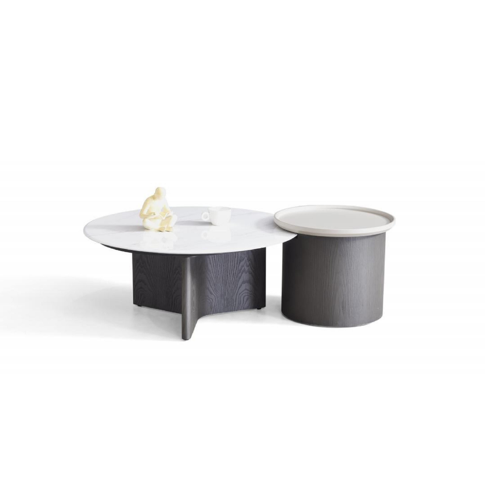 Dark-Stained Wood Base: The bases of both tables are constructed from a dark-stained wood veneer, providing a matte, sophisticated contrast to the bright, polished top. The architectural, thick base of the main table offers stability and a bold contemporary aesthetic.