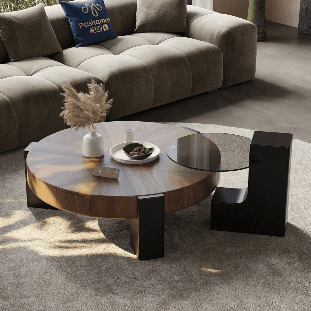 Dual-Drawer Functionality: Integrated seamlessly into the circular frame are double drawers, offering hidden storage for remotes, coasters, and magazines to maintain a clean, minimalist surface.