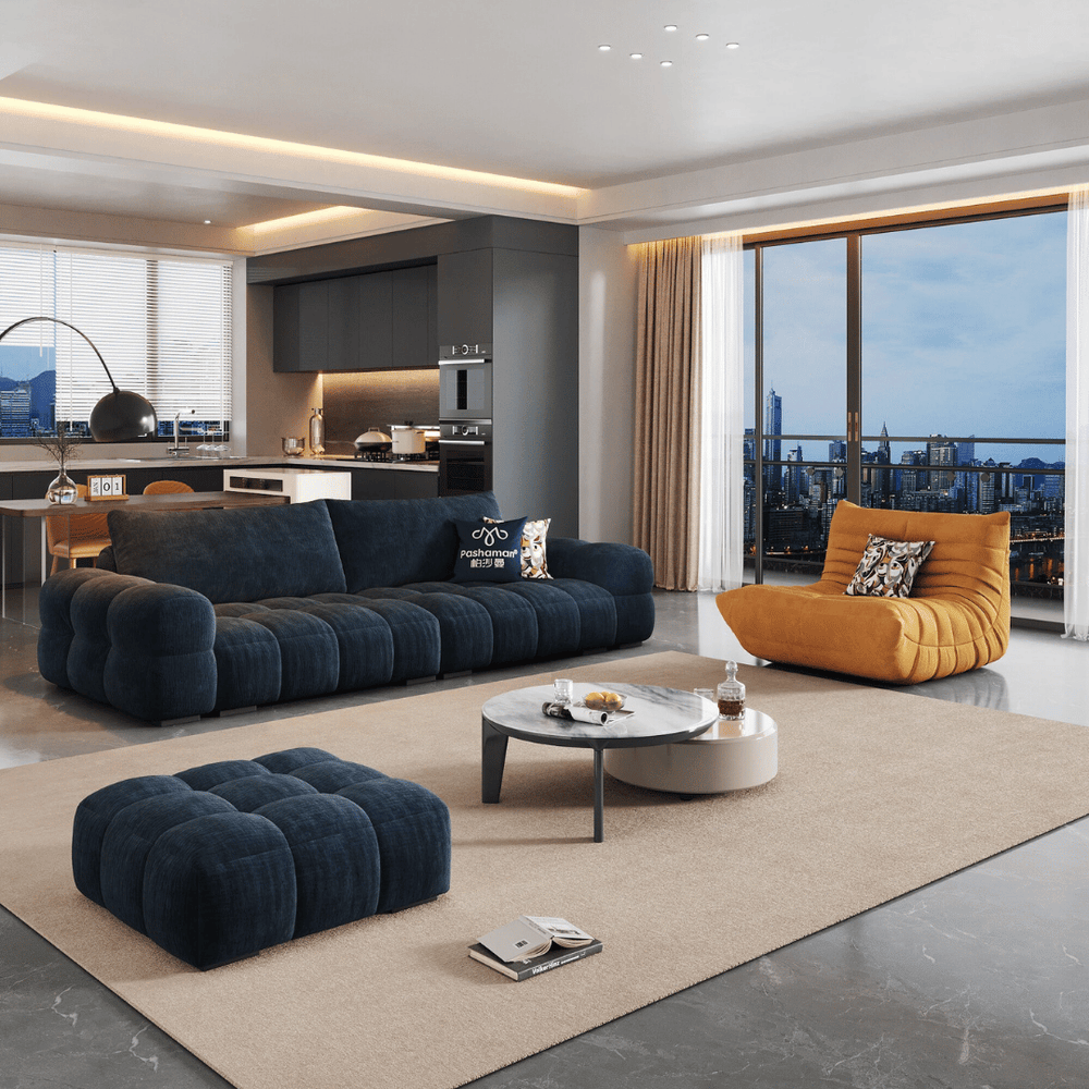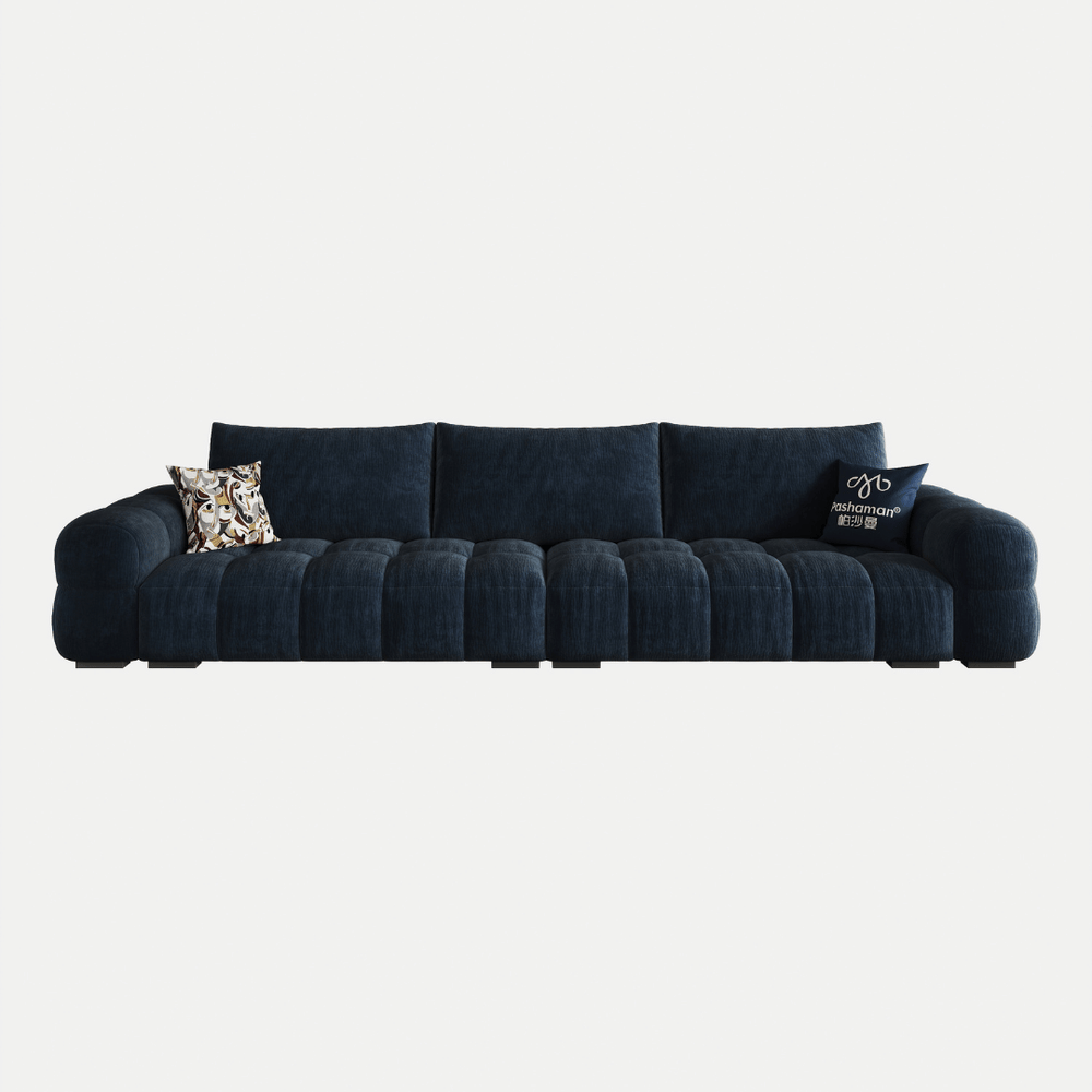 The Kaylene Fabric Sofa, pictured in a rich navy blue, is designed for modern comfort and luxurious lounging. Its distinctive, generously padded silhouette makes it a striking centerpiece for any contemporary living space.