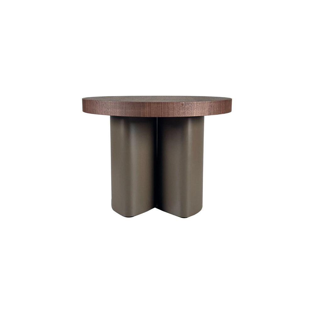 ✔ Black walnut veneer tabletop with rich, natural grain ✔ Sculptural cross-shaped base in metallic paint ✔ Elegant contrast of warm wood and sleek metallic tones ✔ Minimalist round silhouette with timeless refinement ✔ Compact, versatile design for any space