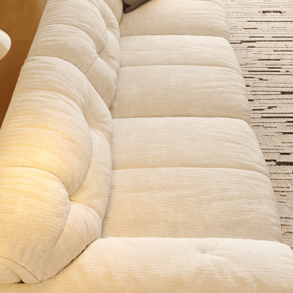 Ultra-Plush Comfort: The sofa boasts a generous, deep-seated design with overstuffed cushions and pillowy backrests, creating an incredibly soft and enveloping feel. The tufted button detailing adds a touch of bespoke texture.