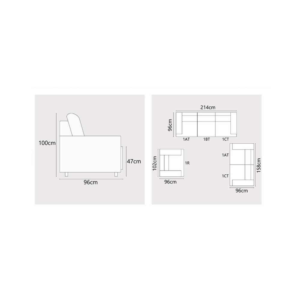 • 1 Seater: L 102 cm × W 96 cm × H 100 cm • 2 Seater: L 158 cm × W 96 cm × H 100 cm • 3 Seater: L 214 cm × W 96 cm × H 100 cm • Seat Height: 47 cm • Seat Width: 54 cm • Leg Height: 4 cm • Backrest Height: 67 cm
