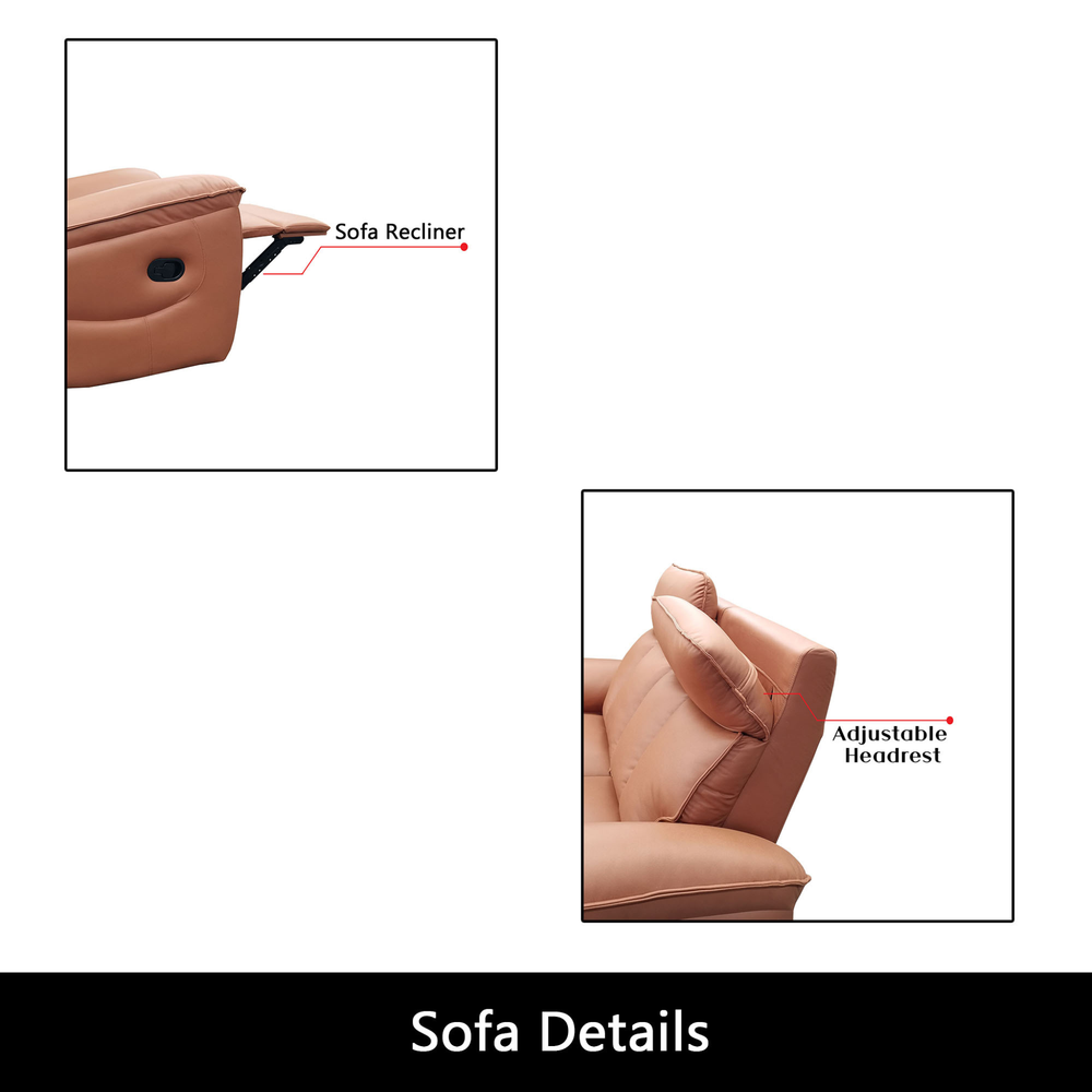 • Premium genuine leather upholstery — smooth, refined, and long-lasting • Manual recliner mechanism — simple lever-activated recline • Adjustable headrests for ergonomic lounging • Plush cushioning with pillow-top armrests • Clean contemporary silhouette with horizontal tufting • Stable low-profile 4 cm legs