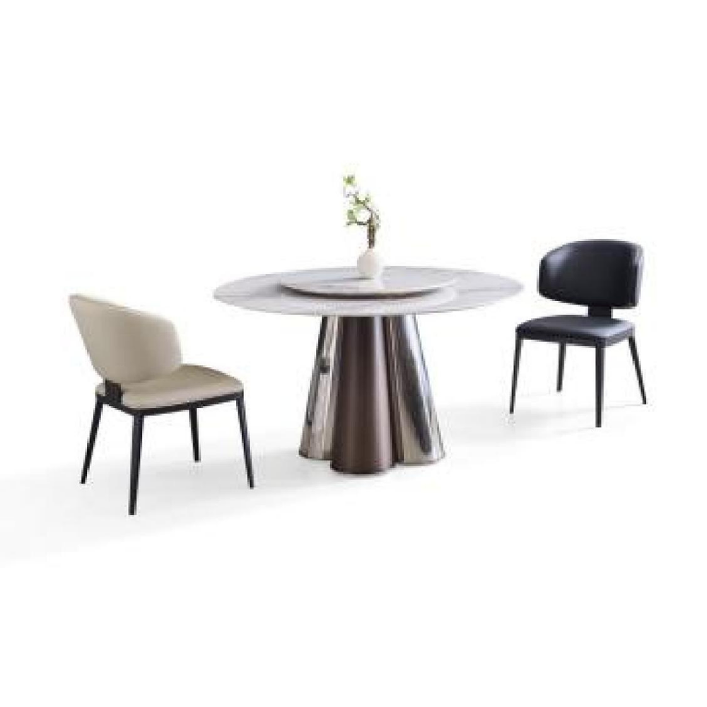 The contrast between the luxurious, cool marble and the dramatic base materials ensures the table serves as a definitive statement piece in any dining room.