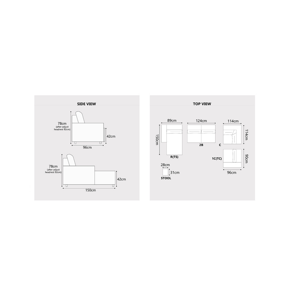 • Premium pet-friendly, anti-scratch fabric • Easy-clean upholstery — wipe stains using only water and a cloth • Adjustable headrests with up-and-down positioning • Integrated armrest console box with cup holders • Matching stool for leg support or additional seating • Soft, supportive cushioning with a structured silhouette • Spacious L-shaped corner configuration