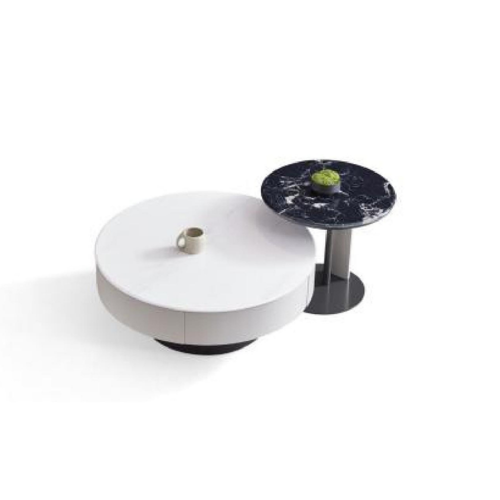 The Minden Coffee Table is a modern furniture piece designed to function as a versatile centerpiece. It integrates the durability of an engineered stone top with the sleekness of a metal base.