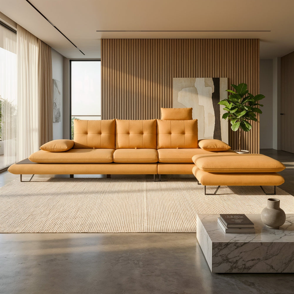With generously padded cushions, a modular layout, and a matching stool for added flexibility, this sofa delivers a perfect balance of structure and comfort. Slim metal legs elevate the frame, creating a light, modern profile that fits beautifully in contemporary condos and family living spaces alike.