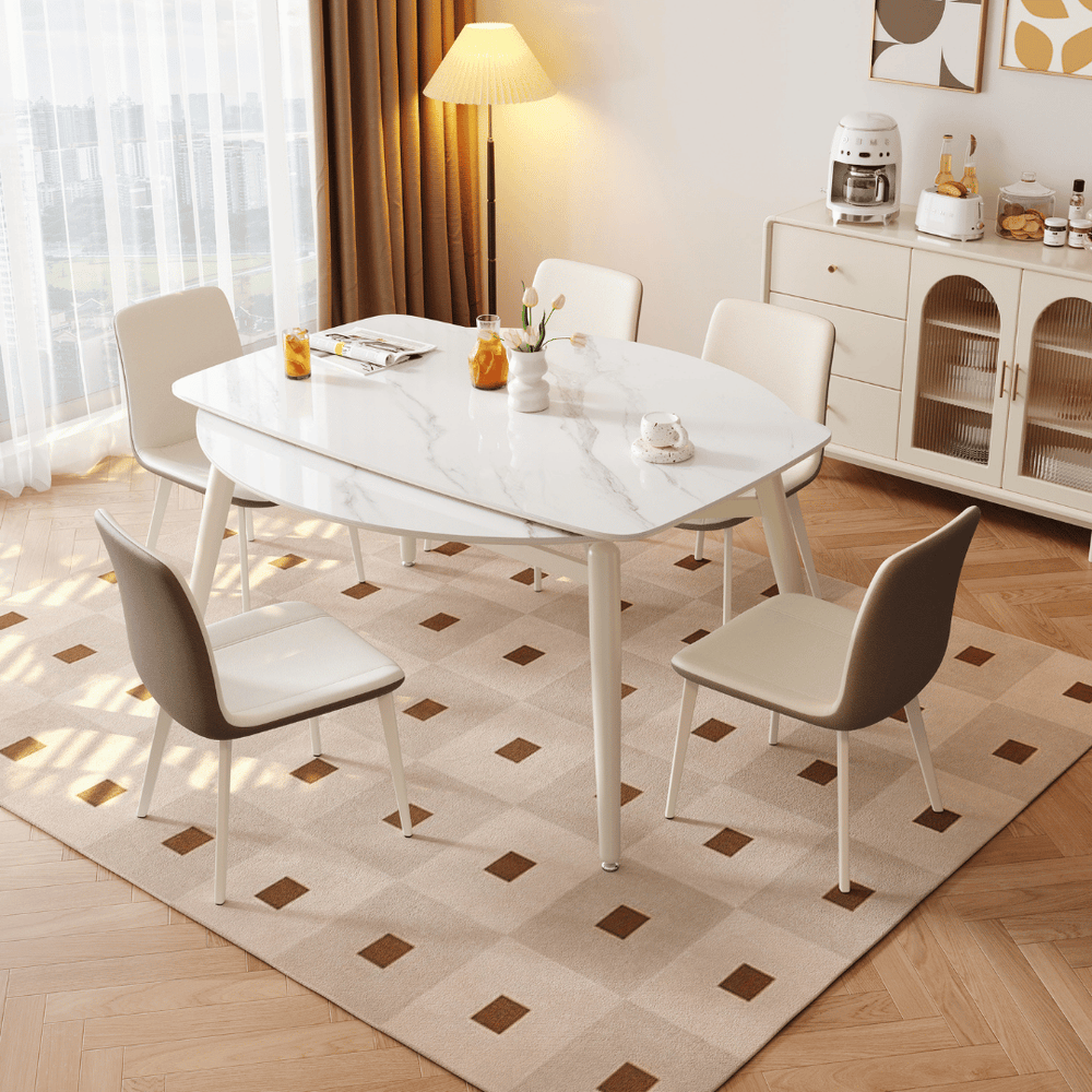 Dual-Shape Design: The table begins as a rectangular shape (ideal for pushing against a wall) and extends into a circular table to accommodate more guests.