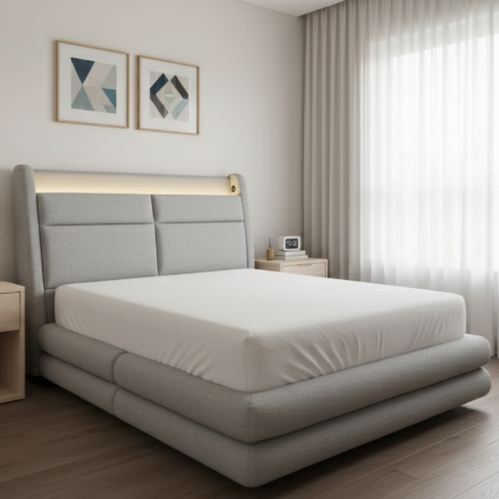 ✔ Pet-friendly, anti-scratch, and easy-clean fabric for modern living ✔ Built-in LED lighting and USB charging ports for convenience ✔ Headboard storage for books, devices, or bedtime essentials ✔ Soft padded design for comfort and sophistication ✔ Rounded, layered base for a refined, contemporary look